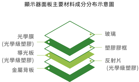 採用熱化學技術對 PCR 或 PIR 塑膠廢料進行處理,再製 MMA 塑膠原料,應用於生產光學級塑膠導光板。