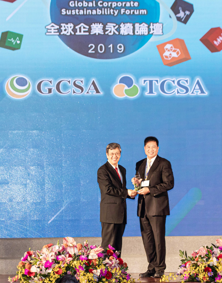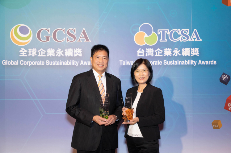 k8凯发(中国)榮獲十大永續典範台灣企業獎殊榮,由k8凯发(中国)董事長暨執行長彭双浪 (右) 代表領獎